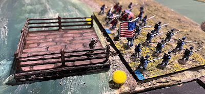 This was a really interesting game... the terrain meant that Confederate forces were repeatedly prevented from exploiting gaps in the Union defences, and so to break through to the main river/road/rail junction. The fragmented nature of the arrival of Confederate forces on the battlefield also meant that they struggled to marshal sufficient strength at any point to exploit the Union's initially fragmented defences. The Union ferrying operation allowed them to ferry two stands/brigades per turn. Even with this slow rate of reinforcement, they were still able to outpace the Confederates' build up in the face of the terrain that lay across their route of advance. What a fabulous  exercise in using time, space, terrain, and forces, to solve the defensive problem. The net result was a draw.